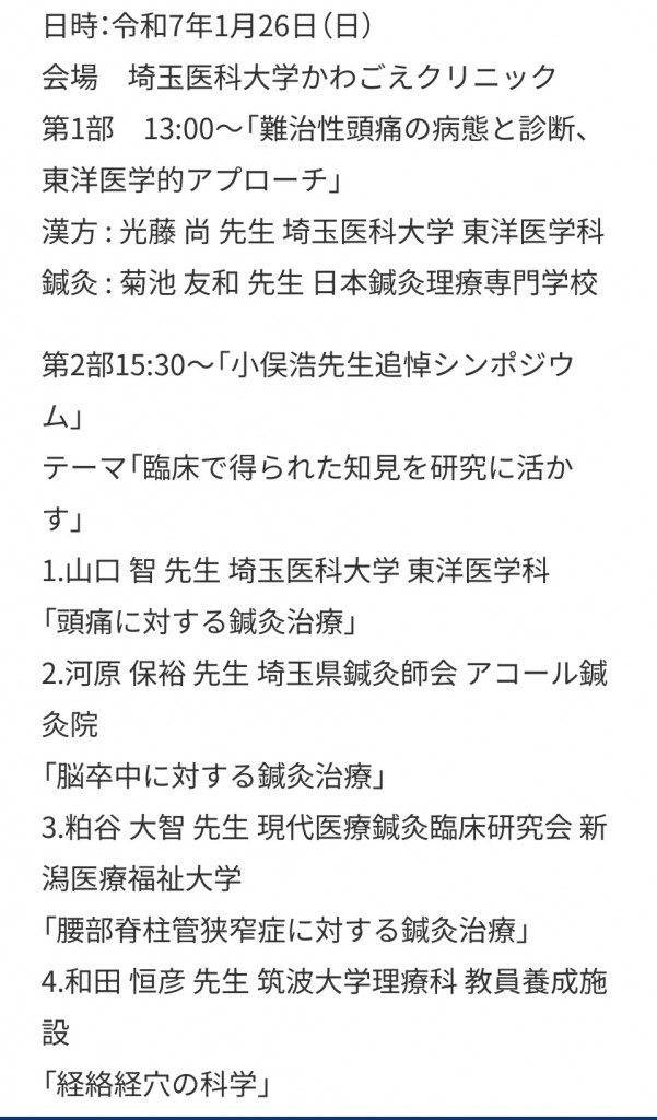 頭痛 腰痛 2025.01.26 2025.10.02 学会に参加してきました Post Share Hatena Line RSS feedly Pin it note 記事のタイトルとURLをコピーする 今日は、埼玉県川越市にある埼玉医科大学かわごえクリニックで開かれた学会に参加してきました。 プログラム 頭痛や脊柱管狭窄症などなど、病態や鍼灸のエビデンスから治療の実際まで、盛りだくさんの内容でした。 産後の腰痛と鍼治療 ― アンケート調査から見えたこと 前の記事 冬と春が混ざってる 次の記事 院長 小井土善彦 全日本鍼灸学会認定鍼灸師。京都市生まれ。 ●略歴 旧早稲田鍼灸専門学校卒業 明治国際医療大学大学院鍼灸学専攻博士課程前期(修士)終了(鍼灸学修士) 筑波技術大学客員研究員(2014年~2017年) 全日本鍼灸学会認定委員会審査委員(2014年~) 現代医療鍼灸臨床研究会会員(評議員) ●教育 神奈川県立衛生看護専門学校 助産師学科 非常勤講師 (2008年~) 森ノ宮医療大学保健医療学部 鍼灸学科 非常勤講師(2009年~2016年) 東京有明医療大学保健医療学部 鍼灸学科 非常勤講師(2016年~) ●所属学会 全日本鍼灸学会、日本母性衛生学会、日本東洋医学会、日本脳神経外傷学会 ●主な研究テーマ 産婦人科領域における鍼灸治療の研究 軽度外傷性脳損傷および軽度外傷性脳損傷に対する鍼灸治療に関する研究 ●趣味、特技 スキー、音楽鑑賞、読書、写真、旅行、ドライブ、釣り、シュノーケリング、キャンプ、ハイキング、料理、ショッピング、昼寝・・・