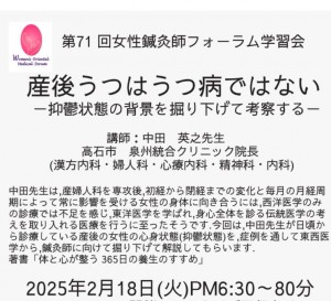 妊産婦さんの負担を少しでも軽減し、自殺に至るケースを無くそうと、様々な施策が実施されています。自殺の要因は複数あり、それぞれが複雑に絡んでいると考えられています。近年注目されている産後うつは、程度や緊急性も様々で、鍼灸師だけでは対応できないケースもあり、保健所や医療機関との連携が欠かせません。そんな中、女性鍼灸師フォーラムの学習会で、貴重なお話を聴くことができました。