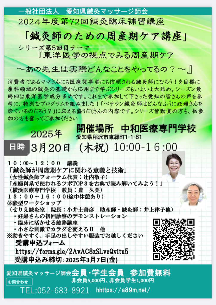 愛知県鍼灸マッサージ師会が主催して実施した鍼灸✖️助産プロジェクトの事業『鍼灸師のための周産期ケア講座』が、今回で5回目になりました。今回は、当院から辻内、井上、小井土が講師として参加します。21日(金)は、臨時休診となります。22日(土)からは平常通りとなります。ご不自由をおかけしますが、よろしくお願いいたします。